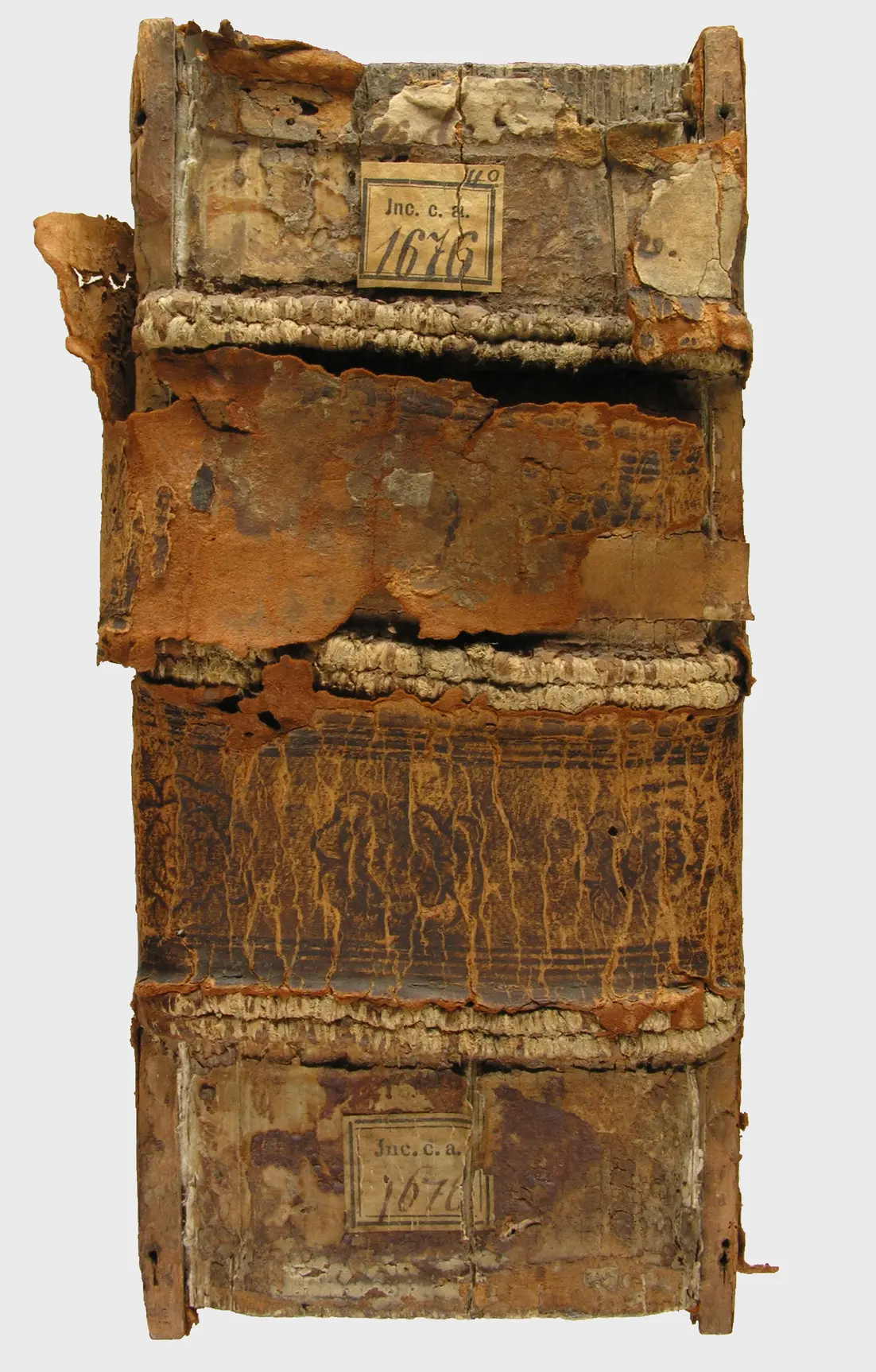 Holzdeckelband, grosse Schäden im Bezug und den Deckeln